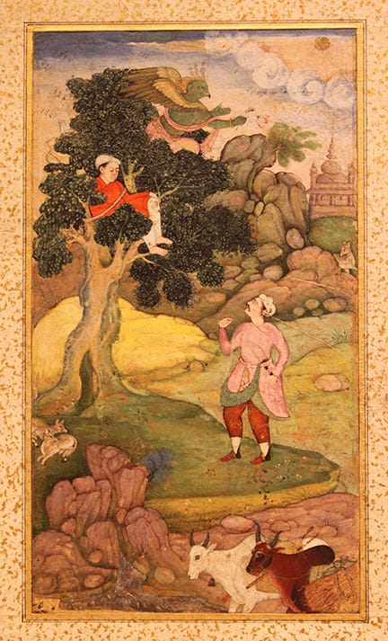 One of its earliest translations was commissioned by the Mughal emperor Akbar (r.1556-1605), who came to know of the Kathasaritsagara on a visit to Srinagar after his conquest of Kashmir in 1589 and shortly afterwards ordered it to be translated into Persian. This translation was also lavishly illustrated. Unfortunately, most of the original manuscript was lost and today only nineteen illustrations survive from this translation, scattered in museums and private collections around the world.